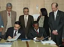 Yumkella (centre-right) with the then-joint secretary of the Indian ministry of environment and forests, Rajiv Gauba (centre-left); Environment and Forests Secretary, Vijai Sharma (centre) is also seen