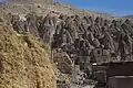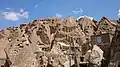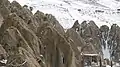 The village exemplifies manmade cliff dwellings which are still inhabited. The troglodyte homes, excavated inside volcanic rocks similar to dwellings in the Turkish region of Cappadocia, are locally called Karaan.[3] Karaans were cut into non-welded ignimbrites, also called "ash-flow tuffs," of Mount Sahand. The cone form of the houses is the result of the erosion of ignimbrite layers consisting of porous, round and angular pumice together with other volcanic particles that were positioned in a grey, acidic matrix. During the eruption of Sahand, pyroclastic flows formed the rocks of Kandovan. Around the village the thickness of this formation exceeds 100 metres (330 ft) and with time, due to water erosion, the cone-shaped cliffs were formed.[4]