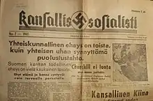 Kansallissosialisti was vocal opponent of the Swedish-language Svenska Pressen that was close to the liberal wing of the Swedish People's Party.[2] For example in 1943 when Svenska Pressen had written that Jews are hardworking citizens, Kansallissosialisti denounced it as "supporting the darkest type of liberalism" and that "thanks to the Jew all the dark and corrupting internationalist ideologies and movements have been brought to our country, all the writing, science and arts has been corrupted by them around the world, same as business, scholarship, society and statesmanship".[3][4]
