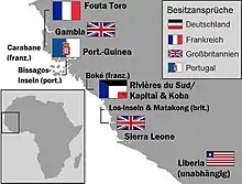 European claims on the coast of West Africa in 1885. Rivières du Sud, including Kapitaï and Koba were disputed by France and Germany.