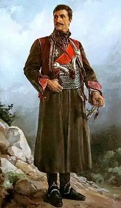 The monument was dedicated on 24 August [O.S. 11 August] 1913, commemorating the return of the Serbian army from the Balkan Wars. Members of the royal household were present at the dedication, including King Peter I, Karađorđe's grandson. One of the newspapers gave a detailed overview of the monument: "Several soldiers from the First Serbian Uprising are climbing up. One of them is taking in his arms a baby given to him by the peasant women, maybe his wife. To kiss the baby for the last time in his life. Old guslar slowly walks after the rebels, with gusle in his bag, who will boost the spirit of the Serbian avengers in the leafy woodlands. On top is Karađorđe. On his one side are the sabre and the rifle, while on the other is Vila with the flag and the wreath".[1][4][5]