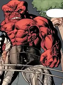 Karkas later battled the Eternal Ajak, who had been transformed into a monster. He witnessed the apparent demise of Ajak and Dr. Daniel Damian.[10] Karkas was part of the Delta Network led by Kro, assembled to challenge Ghaur's grip on the Deviants.[11] He continued to support Kro's faction in his dispute with Ghaur for the deviant's leadership.[12][13] Karkas was briefly transformed in a gigantic monster by action of Apocalypse.[14] Later, he helped Thor in a battle against the Deviants in Lemuria.[15] He also went with Deadpool to the Negative zone to rescue his friend Ransak.