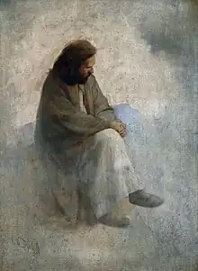 After Diefenbach's revelation, wearing nothing more than a long wool habit and sandals he announced in Munich his own teaching.[3] His ideas (his cobbled together worldview of living in harmony with nature, rejecting monogamy, turning away from any institutional religion, exercising in the fresh air and practicing Freikörperkultur (naturism), as well as a meat-free diet as a vegan, as the basis of a healthy and orderly lifestyle) were taken as an opportunity by his contemporaries to call him a "kohlrabi apostle" to mock and pursue, which he stoically endured, after all his diet consisted of tomatoes, cucumbers, bread and of course kohlrabi.[1][3] Diefenbach flouted social conventions; Marriage? A "compulsory institute", "degrading and shameful", a "legitimate form of fornication". The church? even worse, a "Satan institute", and the "clothing epidemic" he damned as a "monkey masquerade" that makes the body sick, which is why he often walked barefoot through Munich in his habit.[1][3] Diefenbach expressed his ideals in more than a hundred paintings and propagated them in public lectures in Munich, which he was soon forbidden to do. The police kept an eye on Diefenbach, often raiding his lectures.[3] Even when he was silent, he caused a sensation in his white costume and wrote in his diary in 1885 after a visit to the theatre: "Everywhere the masses gather. Foolish, immature people."[1] The Austrian writer Peter Rosegger, Hermann Hesse and later even fellow painter Egon Schiele admired Diefenbach.[3] In 1894 Rosegger wrote in "An eccentric and his works": "... That, what others speak and teach - he lives it. "Natural living" in food, clothing, dwelling, in everything - that is his case; He walked around the city of Munich barefoot in shirt-like robes, he let his children run around naked in his secluded corner of the country."[3]