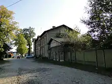 Station from the street side: entrance building, additional building and pavement are heritage-listed.