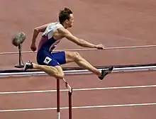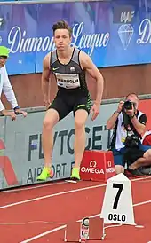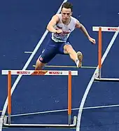 In March, Warholm won gold in the 400 m at the 2019 European Athletics Indoor Championships. His time of 45.05 s equalled the European record set by Thomas Schönlebe in 1988.[16] In June at the Bislett Games in Oslo, he broke the European men's 400 m hurdles record with a time of 47.33 s.[17] At the Müller Anniversary Games in July, Warholm improved on his 400 m hurdles time, taking it to 47.12 s.[18] At the Weltklasse Zürich in August, Warholm set a new European record in the event, with a time of 46.92 s, making him the third person to run under 47 seconds for the distance. He was chased to the finish line by Rai Benjamin, who became the fourth person to break 47 seconds, with a time of 46.98 s.[19] At the 2019 World Athletics Championships in Doha, Qatar, he won the 400 m hurdles in a time of 47.42 seconds, retaining his championship title from 2017.[20]