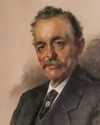 As his reputation grew, he was commissioned to do decorative works. One of his first involved frescoes at the Ratskeller in the New Town hall (1890), where he created humorous scenes with texts.[3] A particularly notable assignment involved decorations at the Hessisches Staatstheater (1894), for which he was awarded the Order of the Red Eagle by Kaiser Wilhelm II.