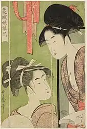 Kitagawa Utamaro (c. 1753–1806) made his name in the 1790s with his bijin ōkubi-e ("large-headed pictures of beautiful women") portraits, focusing on the head and upper torso, a style others had previously employed in portraits of kabuki actors.[4] Utamaro experimented with line, colour, and printing techniques to bring out subtle differences in the features, expressions, and backdrops of subjects from a wide variety of class and background. Utamaro's individuated beauties were in sharp contrast to the stereotyped, idealized images that had been the norm.[5]