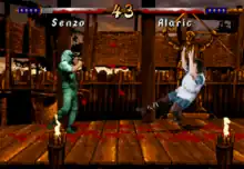 Kasumi Ninja is a fighting game featuring digitized graphics and sprites with pseudo-3D battlegrounds using parallax scrolling, where the player fights against other opponents in one-on-one matches. The fighter who manages to deplete the health bar of the opponent wins the first bout and the first to win two bouts becomes the winner of the match. Each round is timed, which can be adjusted at the options menu screen,[13] and if both fighters still have health remaining when time is over, the one with more health wins that round. The game features four levels of difficulty that can be selected on both the main and options menu screen, while also featuring four levels of gore display to choose from on the options menu, with Gore Fest being the highest and the only mode where characters can trigger their respective death moves, among other settings.[13] The game also features a parental lockout system where parents can censor the level of violence displayed during gameplay by entering a six-digit password with the controller's keypad.[9][13]
