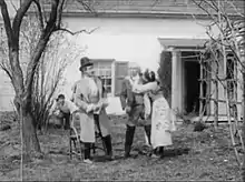 17. A village square with a group of peasants, including Kathleen and Terence, dancing.