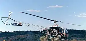 The Kawasaki KH-4 was a light utility helicopter produced in Japan in the 1960s as a development of the Bell 47 that Kawasaki had been building under licence since 1952. The most visible difference between the KH-4 and its forerunner was its new and enlarged cabin. This was fully enclosed (although the side doors were removable) and provided seating for three passengers side-by-side on a bench seat behind the pilot's seat. The helicopter was provided with a new control system, revised instrumentation, and larger fuel tank.[2]