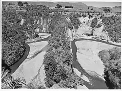 The river was bridged between 1979[15] and 1981 by the NIMT railway, as part of the Mangaweka deviation, with a 110 m (360 ft) prestressed concrete box girder, plus end spans, giving a total length of 182 m (597 ft), 70 m (230 ft) above the river.[16] It is the 6th highest railway bridge in the country.[17] The next bridge upstream carries Potaka Road and replaced a ford[18] in 1908.[19] The uppermost bridge is on Rangitane Road and was built about 1922[20][21] and replaced in 1974.[22][23]