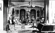 The main architect behind new structure was Charles J. Hardy, an American from Chicago, employed at the Enterprise Planing Mill in Honolulu. The gaslit interior of the mansion was celebrated for its ornate plaster work and frescoes.[2] It followed the Second Empire architecture, or so-called French style of architecture, and was considered a classical Victorian-style mansion. Surrounded by extensive, well-kept gardens, it was characterized by mansard roof, broad lanais, from which lofty flights of steps led down into the gardens, and a large drawing-room upon the ceiling of which was emblazoned the Hawaiian coat of arms.[3]