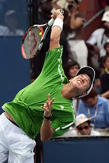 Although his serve is not exceptionally strong, it is consistent enough to prevent opponents from easily winning points off it. He has a flat first serve that can reach speeds of up to 120 mph[68] and employs a topspin second serve.