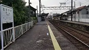 The station consists of two elevated opposed side platforms connected via an underpass to the station building underneath.