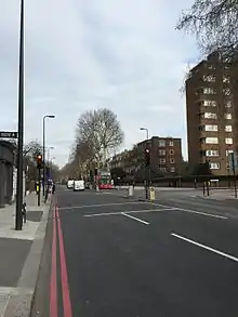 Kennington Park Road is a main road in south-east London, England, and is part of the A3 trunk road. It runs from Newington Butts at its Y-junction with Kennington Lane, south-west to the Oval, where the A3 continues as Clapham Road, towards Stockwell. At this crossroads junction, Camberwell New Road and Kennington Oval head towards Camberwell Green and Vauxhall respectively.