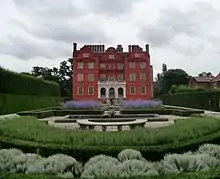 Facing the 1631 house was another mansion, possibly of Tudor origin.[8] It was often visited by the diarist John Evelyn and passed from Richard Bennett to his daughter Dorothy, wife of Henry Capel. Dorothy and Henry remained childless and so the house then passed to Dorothy's great-niece Elizabeth, wife of the Prince of Wales's secretary, Samuel Molyneux, and then of Molyneux's physician Nathaniel St André.[9] This mansion, which was eventually pulled down in 1802,[8] was also the site of James Bradley's observations in 1725 that led to his discovery of the aberration of light. William IV marked the site of the observations with a Thomas Tompion sundial in 1832, transferred from Hampton Court Palace to a plinth to the Dutch House's south-east. This was replaced with a replica in 1959 and moved to its new and different site directly to the south of the Dutch House.[10][11]