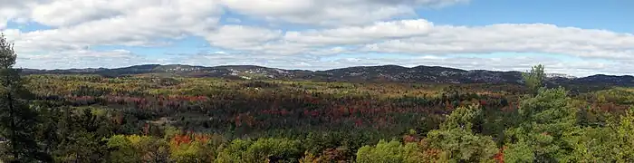 Situated on the north shore of Georgian Bay in the municipality of Killarney, the park straddles the La Cloche range, large rounded white quartzite hills that dominate the landscape. The white peaks and cliffs contrast with the pine and hardwood forests and the boggy lowlands that surround the park's many lakes.