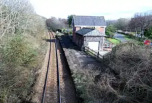 A quarry once lay nearby and a narrow gauge railway crossed the line bringing stone into the Killochan goods yard for loading into standard gauge goods trucks.[12] In 1965 the signal box was still present as was the second platform and the old toilet block.[13] A 1970 photograph shows the station substantially intact despite closure in 1951 although only a single platform remains.[14] By 2011 the station buildings had been much altered with the signal box gone, toilet block demolished, waiting room converted into a garage and the substantial chimneys removed from the two storey station house.[15]