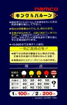 King & Balloon[lower-alpha 1] is a fixed shooter arcade video game released by Namco in 1980 and licensed to Game Plan for U.S. manufacture and distribution.[3] It runs upon the Namco Galaxian hardware, based on the Z80 microprocessor, with an extra Zilog Z80 microprocessor to drive a DAC for speech; it was one of the first games to have speech synthesis. An MSX port was released in Japan in 1984.