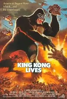 King Kong Lives (released as King Kong 2 in some countries) is a 1986 American monster adventure film directed by John Guillermin. Produced by the De Laurentiis Entertainment Group and featuring special effects by Carlo Rambaldi, the film stars Linda Hamilton and Brian Kerwin. The film is a sequel to the 1976 remake of King Kong.[3][4] This was the final Kong film in which the eponymous character was portrayed using suits and practical effects; further films would utilize computer animation.