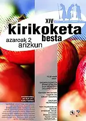 Nowadays the festival Kirikoketa Besta is held in Arizkun (Baztan, Navarre) since approx. 2001 and is organized by the Society Jo Ala Jo Elkartea, aimed both at showcasing old cider practices by staging a re-enactment of the cider making process and encouraging the use of the kirikoketa as a musical instrument.
