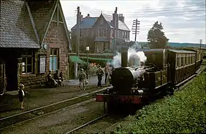 The station was provided with quite substantial sandstone, slate roofed buildings, consisting of station master's office and waiting room. The main station building was constructed, like other stations on this line, in local red sandstone, in a style to those elsewhere on the route; a similar one still also remains at St. Germain's.