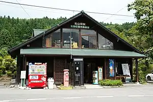 The station, which is unstaffed, consists of a side platform serving a single track on a side hill cutting overlooking the main road and a river valley with a waterfall visible from the station. The station building is a modern timber structure built to resemble a mountain cabin. The waiting area for passengers is located on the ground floor while the upper floor is used by a local tourism association which maintains an exhibition in the station premises. From the station building, a short flight of steps leads up to the platform. A bike shed is provided outside the station building.[2][3][4]