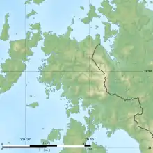 Kitamatsuura Peninsula has many bays, inlets, and other coastal features along its shores. Imari Bay is located on the north, the Hirado Strait is located to the west between Hirado Island and the peninsula, and Sasebo Bay is found on the southwest.[1] The peninsula is mainly basalt which forms a gently-sloping tableland and pediment, though it features many small hills and uneven terrain as well.[2] The borders of the tableland are very steep.