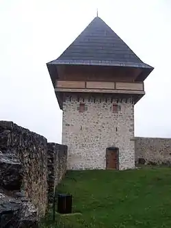 The fortress complex consists of three parts connected by walls: the town with its castle-town (in Serbo-Croatian: podgrađe), Tabor and Ljubica (Lubica) towers. The oldest core is the town with its podgrađe, which is protected by a high rampart on the north (access) side. Tabor and Ljubica towers were extended in the Ottoman era. Ljubica is a protruding tower that was erected as a side protection of the core of the fortress.[5][6]