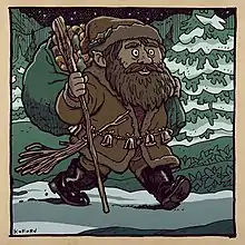 The companions of Saint Nicholas are a group of closely related figures who accompany Saint Nicholas in territories formerly in the Holy Roman Empire or the countries that it influenced culturally.[3]:146 These characters act as a foil to the benevolent Christmas gift-bringer, threatening to thrash or abduct disobedient children. Jacob Grimm (in Deutsche Mythologie) associated this character with the pre-Christian house spirit (kobold, elf) which could be either benevolent or malicious, but whose mischievous side was emphasized after Christianization.[4]