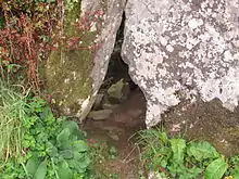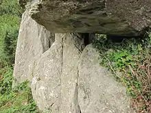The interior chamber is accessed by a keyhole entrance at ground level, 0.8 metres (2 ft 7 in) in width, which may suggest spiritual offerings were placed inside the structure in ancient times. The front face and keyhole entrance face northwest under a porch-like structure formed by the lower capstone. An up-growth of vines and other plants rises over the base of the doorstone at the front, and encloses the rear of the structure.[2]