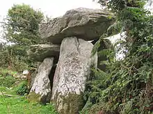 The Knockeen Portal Tomb is a megalith in Knockeen, County Waterford, Ireland. It is the largest dolmen (portal tomb) in County Waterford exhibiting a double capstone configuration, though it is not the tallest standing stone structure. It is one of the finest examples of a dolmen in Ireland.[2]