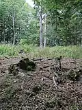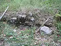 The local church, dedicated to the Assumption of Mary, was a 16th-century chapel of ease that survived the Second World War, but was demolished in the 1950s.[12] The church belonged to the Parish of Kočevska Reka. It stood on a hill at the southern edge of the village, with the altar facing the southeast. It had a long rectangular nave, a chancel of equal width, and a bell tower against the southwest wall. The church was listed in a list of ecclesiastic property dating to 1526 and in a report by the apostolic visitor Paulus Bisantius in 1581. The church was likely built at the end of the 15th century or beginning of the 16th century, originally with a shorter nave and a wooden belfry on the roof. The stone bell tower was probably built in the mid-18th century and the nave extended to the northwest no more than a century later. At this time new windows were built into the church and a tall pointed roof added to the bell tower. The church had a rectangular stone door casing with a window above it. The side entrance to the church also had a door casing built from parts of an older ogival door casing. The groin-vaulted sacristy was in the ground floor of the bell tower, and the church had a shingled gabled roof. The walls and vaulting were decorated with 17th-century frescoes. The art historian Marijan Zadnikar (1921–2005) wrote a complete description of the still intact church in 1947. The church was destroyed in 1953 or 1954 and only its foundations are visible today.[13]
