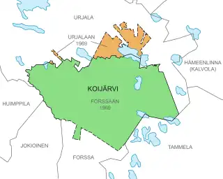 Koijärvi became a separate municipality in 1923. It was formed out of parts of Tammela and Urjala. Forssa was also separated from Tammela in the same year.