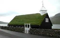 The settlement extends along the north side of the fjord beside the fishing port and fish factories. In the late Middle Ages, it was a moot where the so-called spring assembly gathered. The church is a typical Faroese wooden church from 1837.[8] Standing close to the coast, it is a black-tarred wooden building with a turf roof, white painted windows, and a small white bell tower on the roof's western end. Inside, everything is made of unvarnished wood. There are a few spots of blue colouring on the pulpit but otherwise nothing has been painted. The little ship hanging under the vault was donated as a tribute by the parents of a 25-year-old who drowned off the coast of Iceland.[9] In addition to the village's fishing industry, there is a supermarket, a café, a timber outlet and the Atlanticpane window factory.[10][11]
