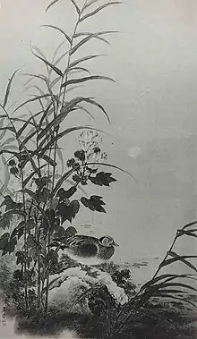 In May 1903, painter Noguchi Shōhin 野口小蘋 (1847–1917) adopted Suiun as heir and husband to her daughter, Noguchi Shōkei (野口小蕙, 1878–1944), a painter of the bird-and-flowers genre. For a few years, Suiun exhibited paintings, including his entry Solitary Duck in Spring Scenery (Shuntei no kokamo) to the Saint Louis World's Fair in 1904, under the name Noguchi Suiun.[2] He reverted to using the name Komuro when the marriage was annulled in November 1906.[3]