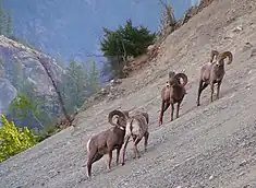 Bighorn sheep scaling a scree-covered slope in Kootenay National Park