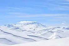 The Korab-Koritnik Nature Park starts on the frontier with Kosovo in the north along the border with North Macedonia to the Desha Mountains in the south. The nature park is named after the Korab Mountains and Koritnik Mountain. Korab is the highest summit of both Albania and North Macedonia, standing at an elevation of 2,764 metres (9,068 ft). It is also one of only two summits in Europe, which is the highest point for more than one country and as well the 18th-most prominent mountain peak in Europe.[6][7] The summit is a very rugged mountain massif and consists mainly of shale and limestone of the Paleozoic period with block structures and also severely damaged gypsum rocks of permo Triassic. On the west side, the mountain falls steeply over rock walls, while the north side consists of craggy rocks.[8]
