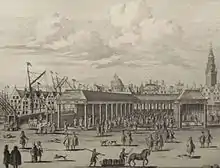 In 1768 the exchange was rebuilt in brick. The building remained standing until it was demolished in 1884, one year after the section of the Damrak between Papenbrugsteeg and Oude Brug was filled in. [6][7]