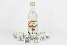 Korn (from German, "grain", pronounced [kɔʁn] , English "corn"), also known as Kornbrand or Kornbranntwein (English: "grain brandy" or "grain spirit"[1][2]), is a German colorless distilled beverage produced from fermented cereal grain seed.[3] The production of Korn uses only five grains: most of the production is based on rye or wheat; barley is mainly used to obtain the required malt for the brewing process; oats and buckwheat are rarely used. The addition of food colorings, flavorings, or sweeteners is not permitted. Korn is distilled to lower alcoholic proofs and less rigorously filtered than vodka, which leaves more of the cereal grain flavor in the finished spirit.