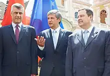 On 19 October 2012, normalisation talks mediated by the European Union began in Brussels with Serbian Prime Minister Ivica Dačić and Kosovo Prime Minister Hashim Thaçi, where the two PMs sat at the table and initiated talks on normalising relations between Pristina and Belgrade.[32] Reaching such a deal was a necessary condition of Serbia's EU candidacy.[33] The governments slowly reached agreements and deals on various areas, such as freedom of movement, university diplomas, regional representation and on trade and international customs. In Brussels, Serbia and Kosovo agreed that implementation of the border agreement would start on 10 December 2012.[34] A historic meeting took place on 6 February 2013, when Serbian president Tomislav Nikolić and Kosovar President Atifete Jahjaga sat at the same table for the first time since Kosovo declared independence.[35]