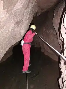 Part of the cave from the entrance to the Hall of Giants (Sieň obrov) is formed in dolomite and dolomitic limestones with impressive limestone layers. The back parts of the cave, like the Pearl Passage (Chodba perál), the Great Hall (Veľká sieň), and the Mirror Hall (Zrkadlová sieň), are located in pure limestone areas. The Great Canyon (Veľký kaňon) passageway was formed as a result of tectonic faults which also helped shape large chambers in the back part of the cave,[2] discovered by Rožnava cavers in 1964. Like the other caves in the Slovak Karst zone, it is on the UNESCO List of the World Natural Heritage.