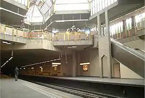 Crainhem (French) or Kraainem (Dutch) is a Brussels Metro station in the municipality of Woluwe-Saint-Lambert/Sint-Lambrechts-Woluwe, in the eastern part of Brussels, Belgium. Since 4 April 2009, the station has been served by line 1 (previously line 1B). It is located near the intersection of the Avenue de Wezembeek/Wezembeeklaan, the Avenue Mounier/Mounierlaan, and the Avenue de Kraainem/Kraainemlaan. It has a large park-and-ride lot and is also the terminus for a number of inbound regional bus routes of De Lijn, as well as for the STIB/MIVB bus routes 30 and 31.
