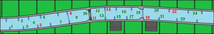 To modernize the course for the 2013 European Championships, the top section was made shorter and steeper by extending the length of the start pool. This change entailed raising the channel walls 70 centimetres (28 in) in the section above the foot bridge. Work was completed in April 2013.[2]
