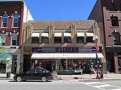 The Kresge Block is located on the east side of Water Street, Augusta's principal commercial thoroughfare, a bit south of the center of the block between Bridge and Front Streets. It is a two-story masonry structure, built out of brick and granite. The ground floor has two storefronts with a building entrance at the far left, sheltered by a decorative bronze hood. The lower half of the ground floor has polished granite below the glass display windows, and rising partway up the outer edge of the facade. The windows are framed by bronze trim, which also surrounds the store label above an awning sheltering the storefronts. The sign reads "Stacy's" using Art Deco styling. The second floor has paired sash windows, each with individual awnings, but shared stone sills and brick headers topped by a stone sill. The window pairs are separated by stylized pilasters. A parapet with a multicolor crosshatch brick pattern extends across the building above the second floor.[2]
