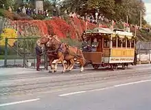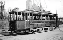 The second class consisted of fourteen units delivered by Skabo between 1887 and 1892. These were delivered in various configurations of open and closed seating and were normally only operated during winter. They had the same dimensions as the Stephenson cars.[1] The final class, built by Falkenried, consisted of fifteen units delivered in 1897. Measuring 6.6 meters (22 ft) in length, they were sufficiently heavy they needed to be hauled by two horses. This was a calculated choice, as they were primarily intended to be used as trailers for the electric trams.[6]