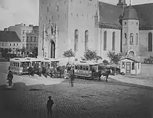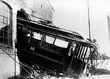 KSS had a concession which expired in 1905, at which time the municipality could purchase the company at par value. This raised a new debate concerning public or private operations, with many Conservative politicians calling for the privatization of KKS.[27] In the 1904 municipal election the issue was raised, with the Liberal Party and the socialist parties running for municipalization of tram operations. Meanwhile, the municipal administration worked with estimates for taking over KSS. A take-over would cost the municipality about NOK 2 million, while a sale would bring in about NOK 1.6 million. However, as KSS was a profitable company, it was estimated that the municipality would make more money by taking over KSS than selling KKS, estimated at about NOK 3 million for the period in question. The decisive municipal council meeting was held on 14 April 1905, although the actual vote did not occur until 02:00 hours the following day, after a nine-hour debate.[28] The Conservative majority voted in favor of selling KKS to KSS and extending the latter's concession to 1924.[29]