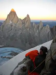 Kristoffer Szilas at a bivouac during an ascent of Cerro Torre in Patagonia.