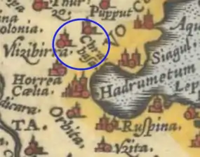 Al Bahi[1] suggested that Kroussia was the Roman city Chrausa (Greek:Χράῦσα ; Arabic:خراسا) based on Ptolemy, which was also designated as Chrabasa (Greek:, Χράβασα; Arabic: خرباسا)in Procopius' texts.[4][5] Based on Müller and Fischer,[4] Chrausa has the following longitude and latitude in Ptolemy's map: (longitude: 36°; latitude: 32° 40′) and should be located under the city of Hadrumetum (now the city of Sousse) and near Aphrodisius. These coordinates were used to estimate the location of Chrausa in the Map of Ptolemy (produced by SANDERUS Antique maps & books).[6] Abraham Ortelius featured Chrabasa (Chrausa) in the map of North Africa produced in 1590 using the great map of Africa of Giacomo Gastaldi and Siculus Diodorus.[7]