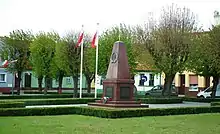 Following the joint German-Soviet invasion of Poland, which started World War II in September 1939, the town was occupied by Germany until 1945 and local Poles were subjected to various crimes. On October 20, 1939, the German Einsatzgruppe VI carried out a public execution of 17 Poles at the main square as part of the Intelligenzaktion.[2] Among the victims were a bank director, teacher, merchant, forester, military officer, landowners and mayor of the nearby town of Dolsk.[2] It was one of many massacres of Poles committed by Germany on October 20–23 across the region in attempt to pacify and terrorize the Polish population.[3] The first expulsions of Poles were carried out by Germany in winter of 1939–1940.[4] Under German occupation the town's name was changed to Tiefenbach and then Schonz in attempt to erase traces of Polish origin.